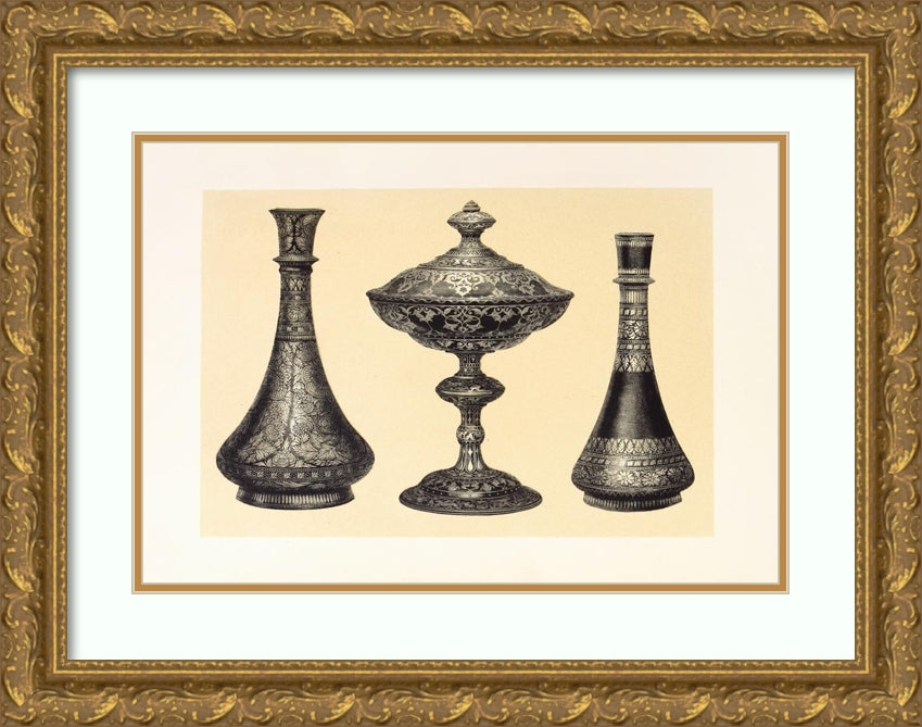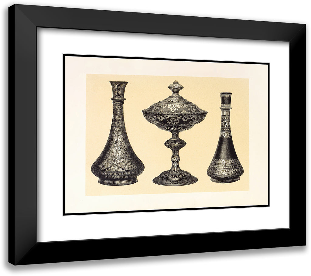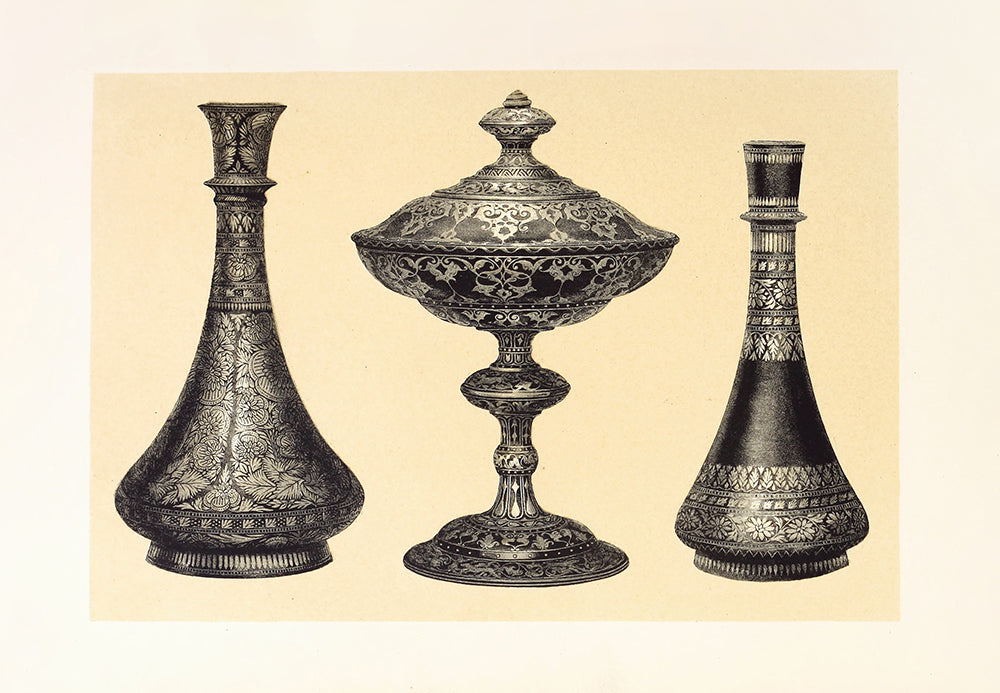 / Recent Indian Vases in Oxydised Pewter, Encrusted or Damascened with Silver. Tazza in Wrought Iron, Inlaid with Silver (1858)