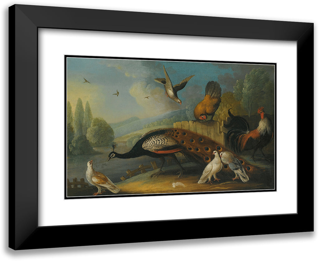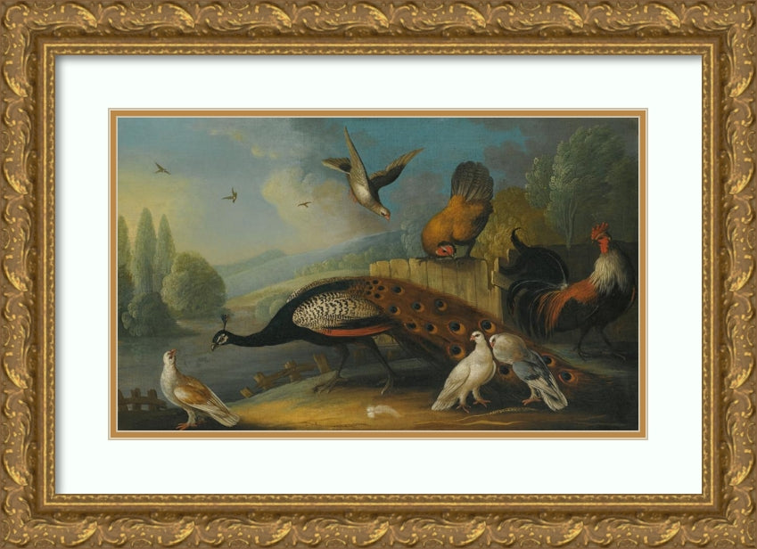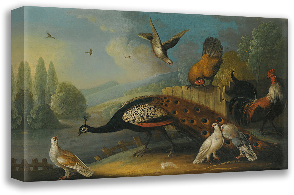 / A Still Life with a Peacock, Pigeons and Chickens in a River Landscape