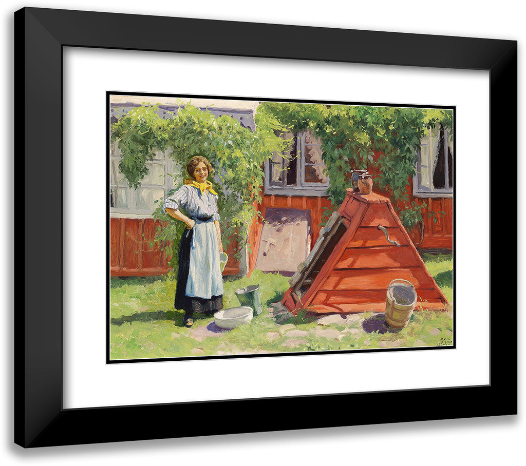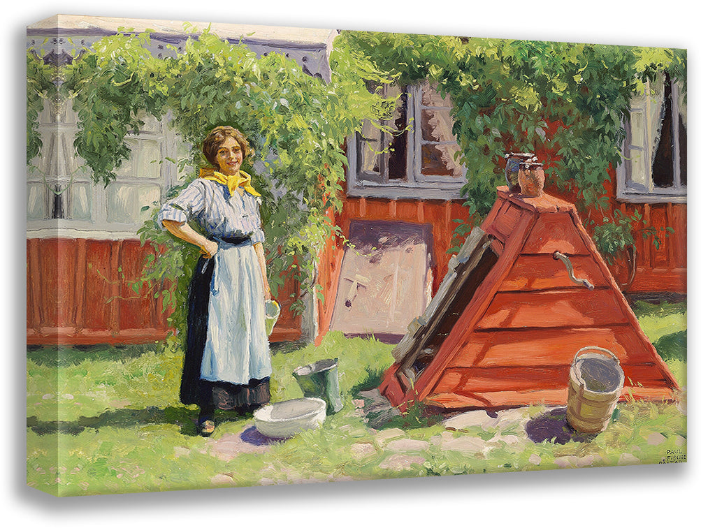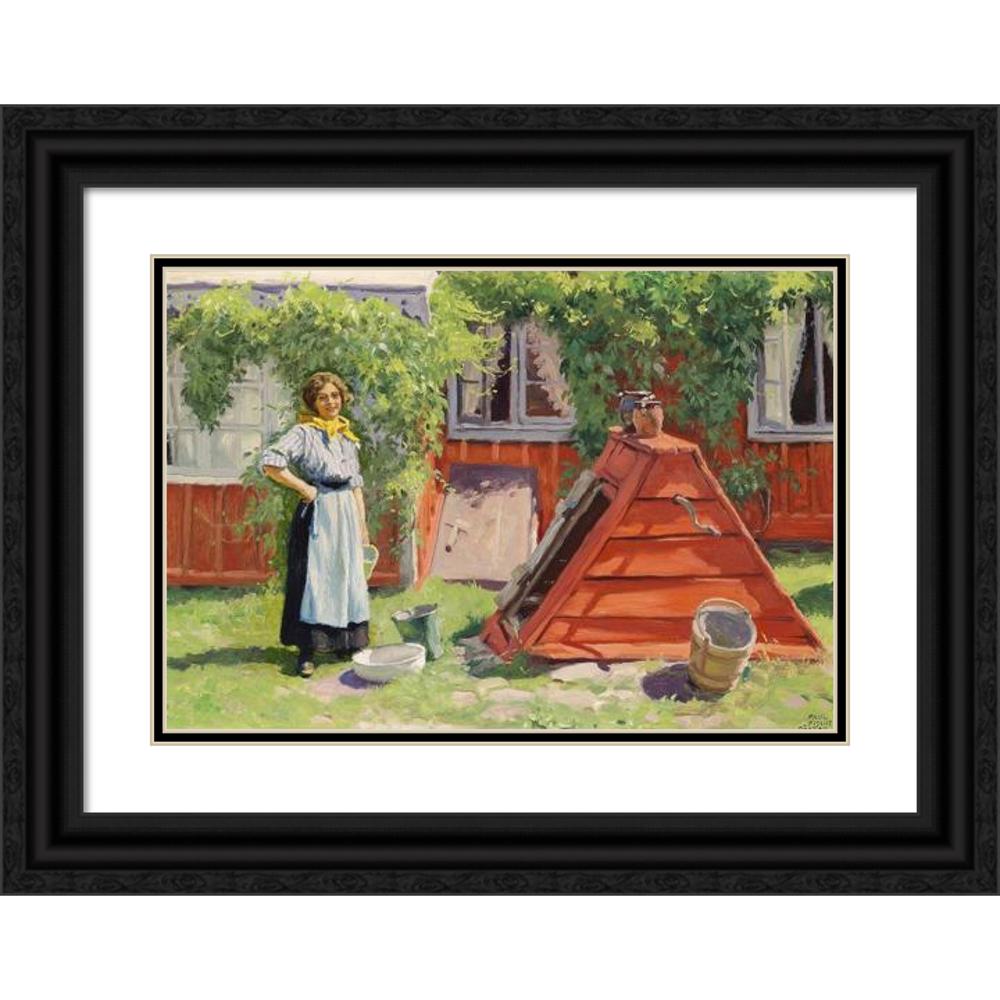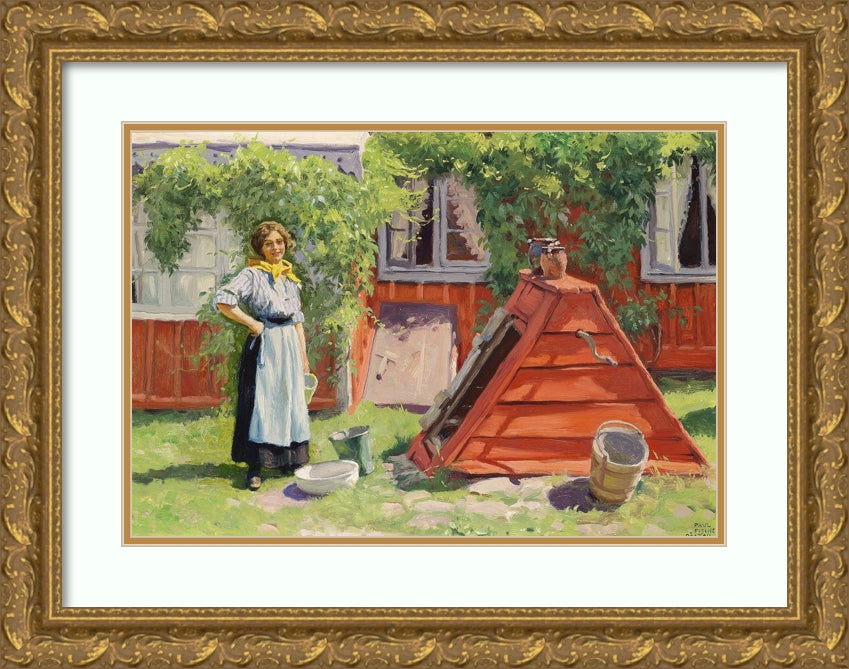 Girl by a Well off a Red -Painted Swedish Wooden House