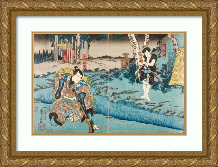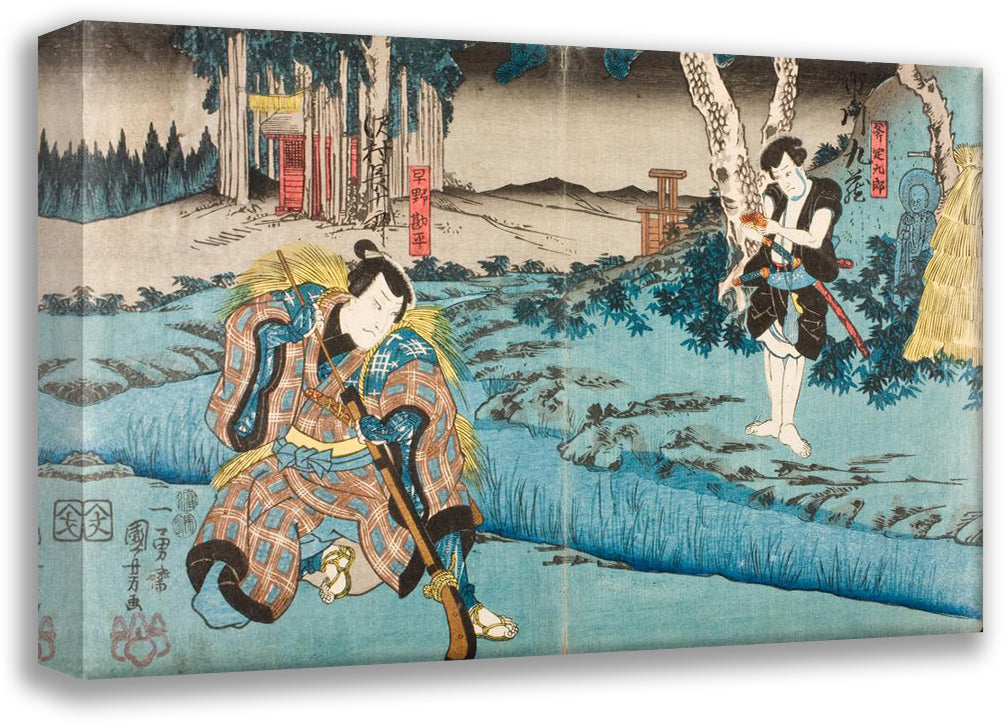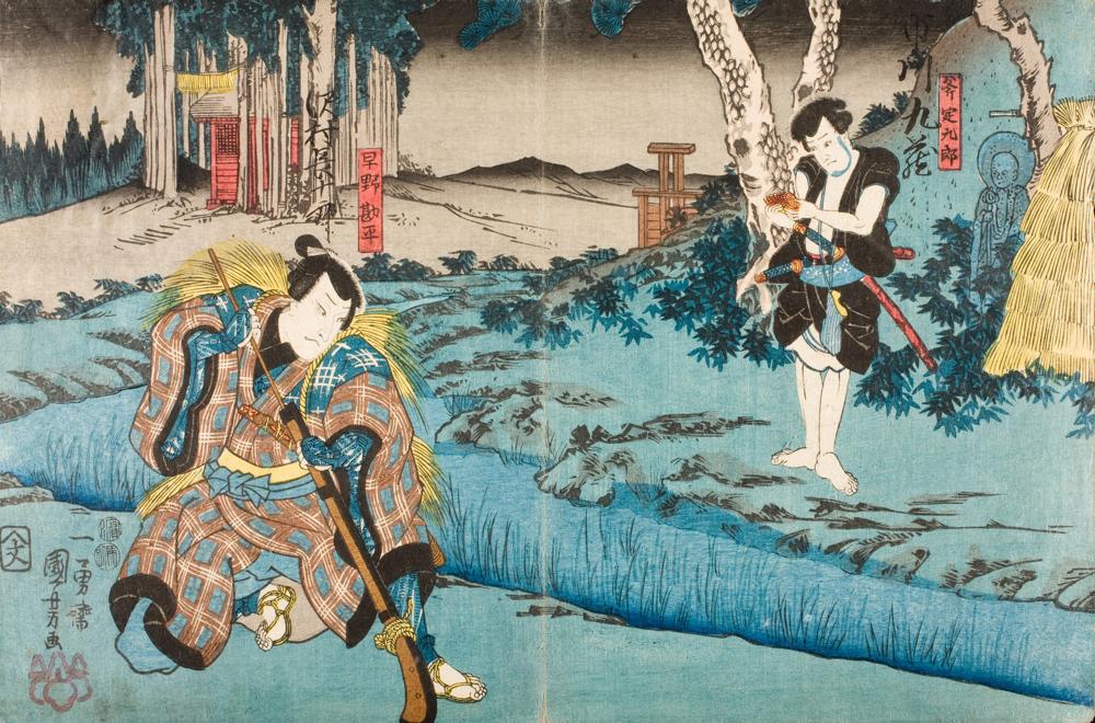 / Sawamura Chojuro V as Hayano Kanpei and Ichikawa Kuzo II as Ono Sadakuro in Act Five of the Play Kanadehon Chushingura (circa 1849)