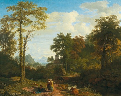 Jan Griffier A Vast Mountain Landscape with Peasants Resting Near a Path and a Small Fortified Town in a Valley from $9.99