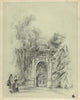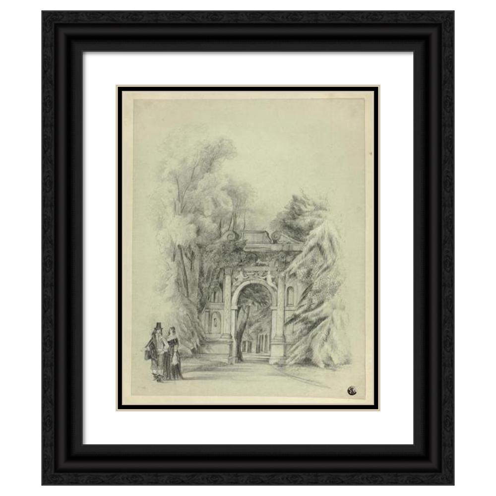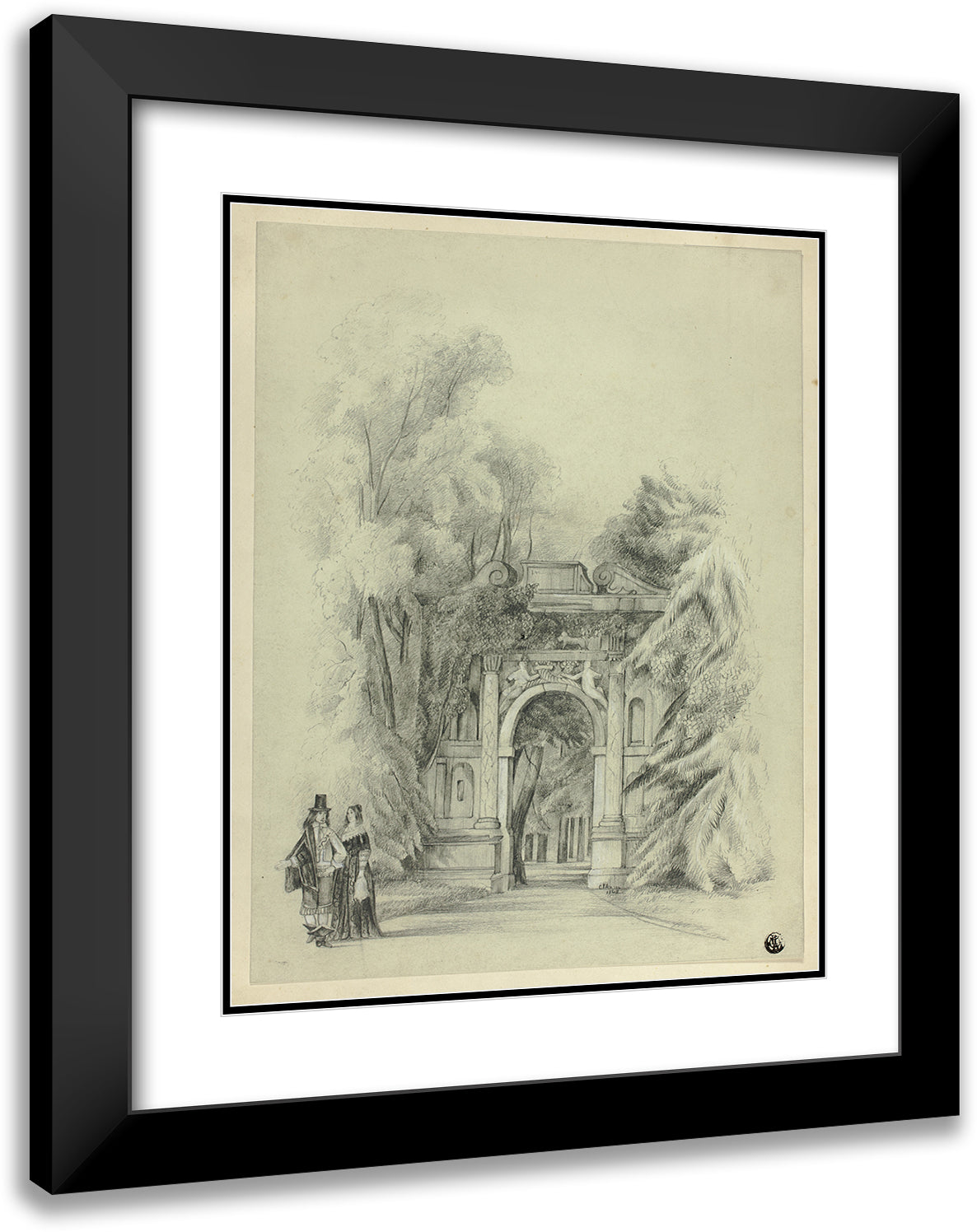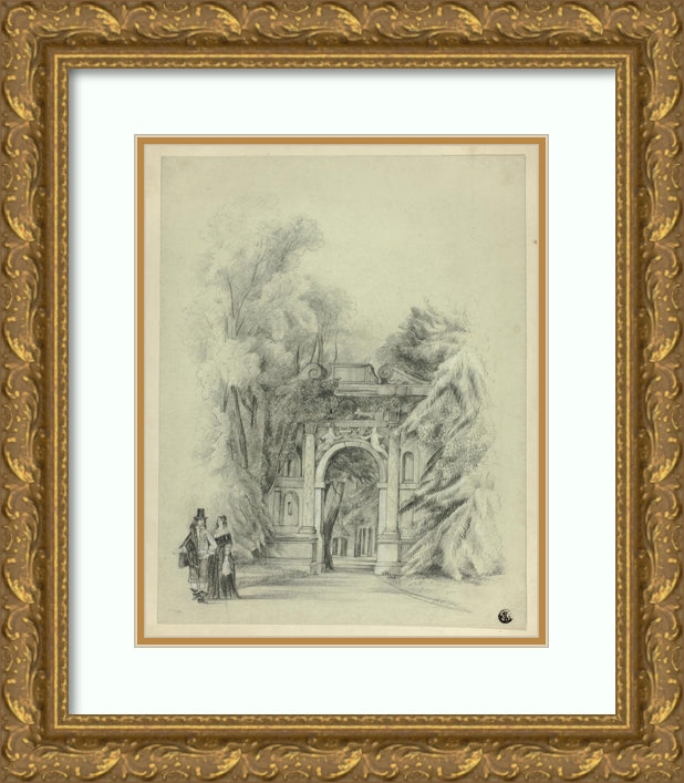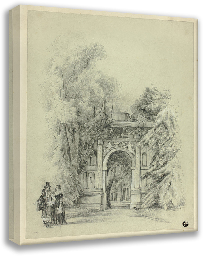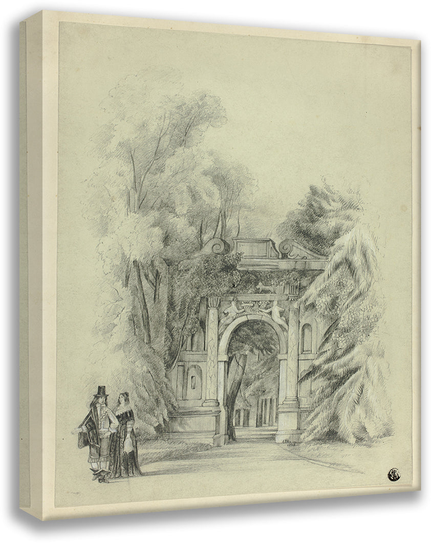 Couple in 17th Century Dress Standing Before Entrance to Park (1864)