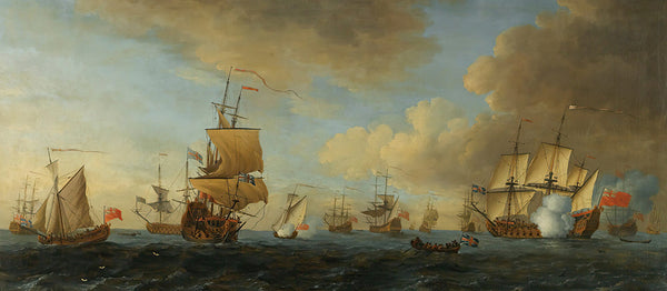 John Cleveley the elder An English Frigate Under Sail Firing a Gun, with Shipping at Anchor and Under Sail from $9.99