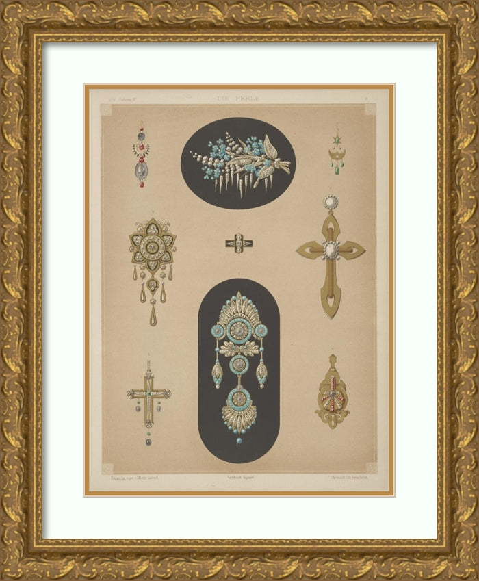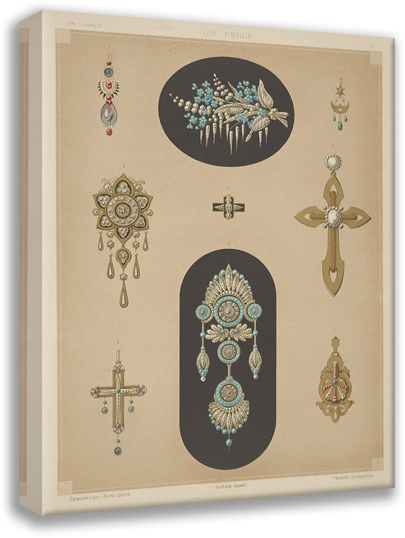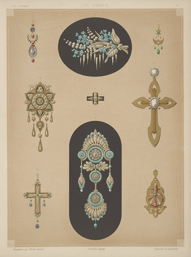 / Nine Designs for Jewelry, Including Two Large Pins with Blue Stones and Diamonds. (1872 - 1873)