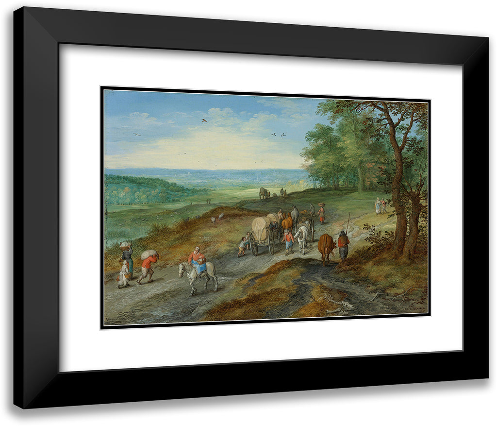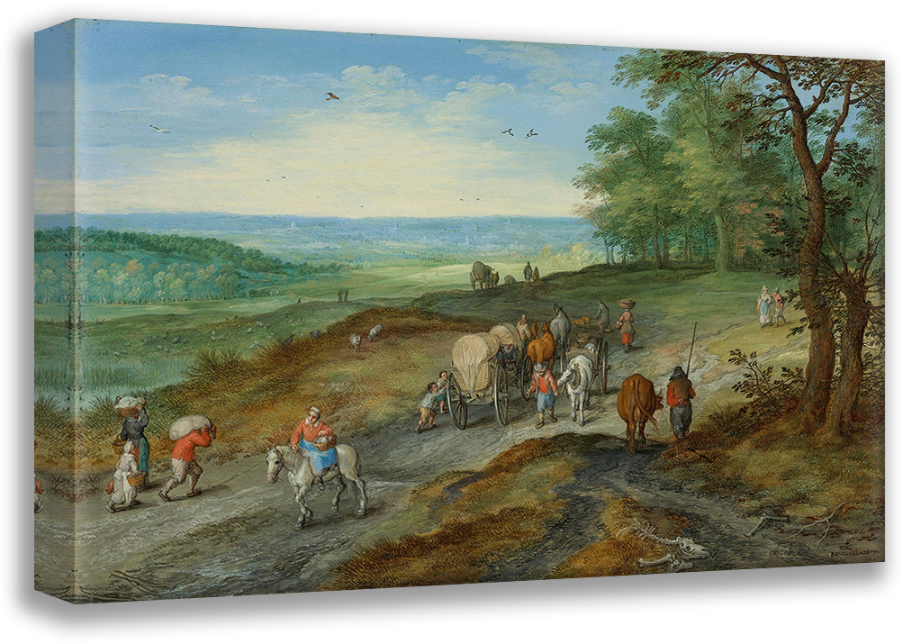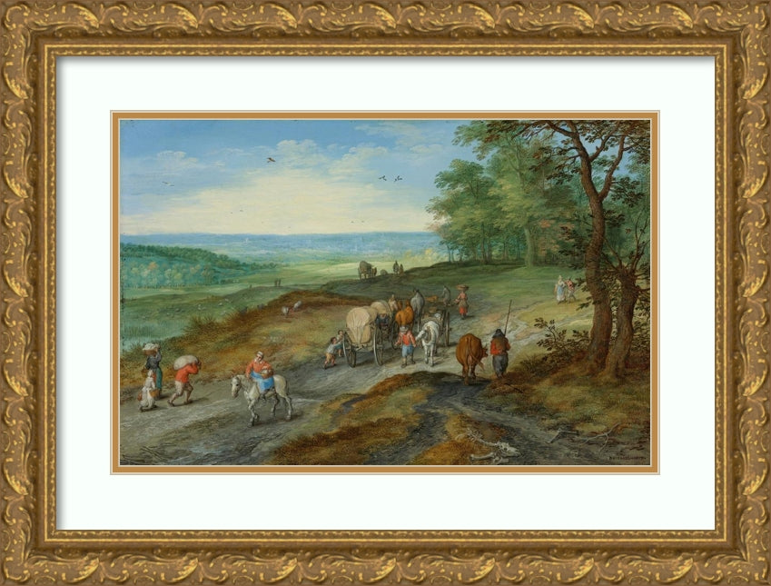 / A Panoramic Landscape with a Covered Wagon and Travelers on a Highway (1612)