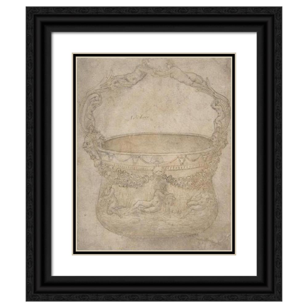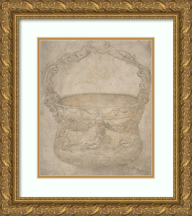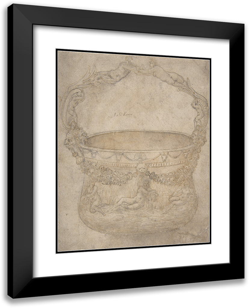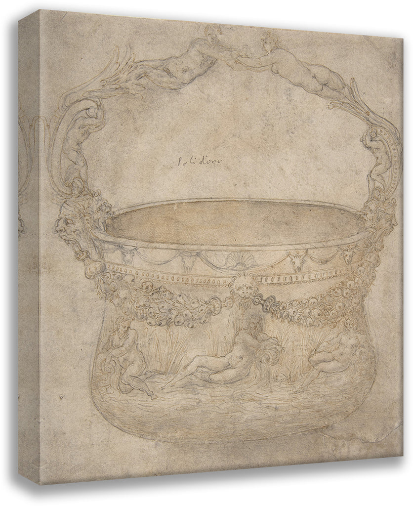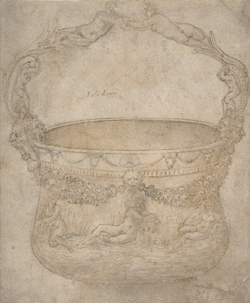 / Design for a Bucket-Like Vessel with a Handle of Interlaced Figures, on a Body Adorned with Bucrania, Garlands, and Three River Gods (1540-50)
