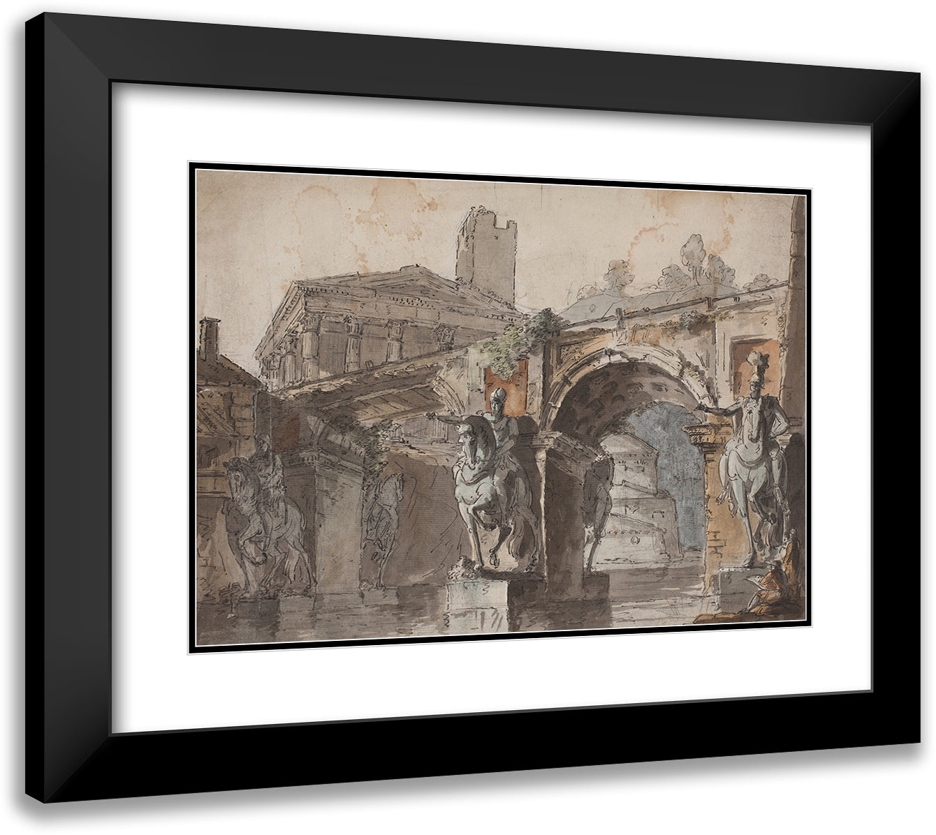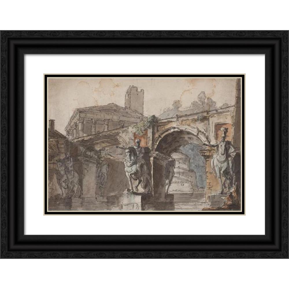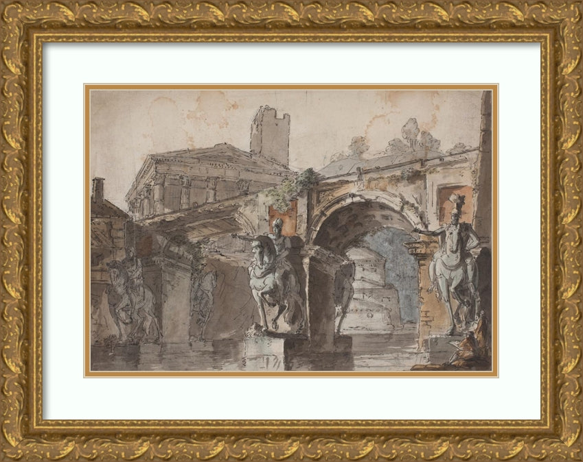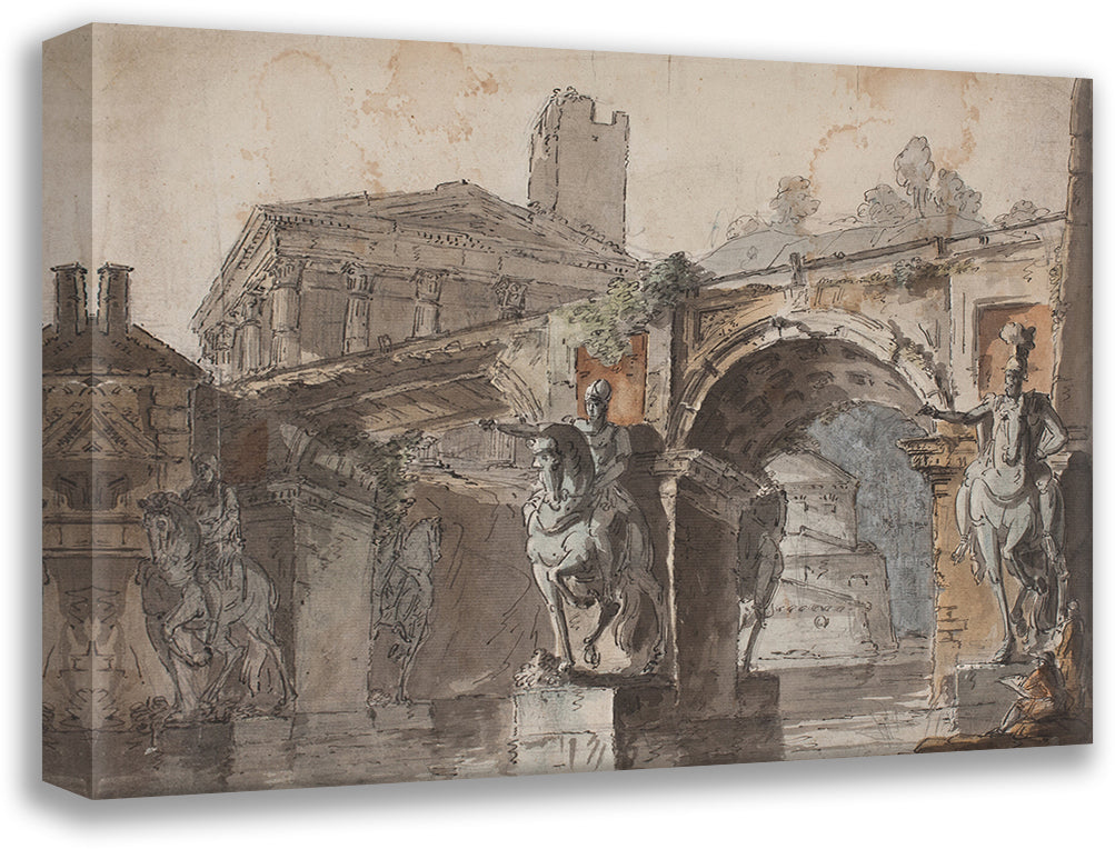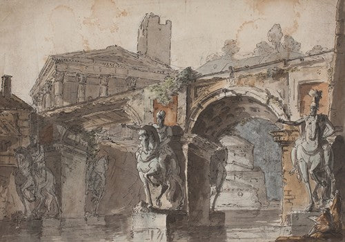 Roman' Prospectus with Bridge, Temple Ruin and Equestrian Statue (1730 - 1790)