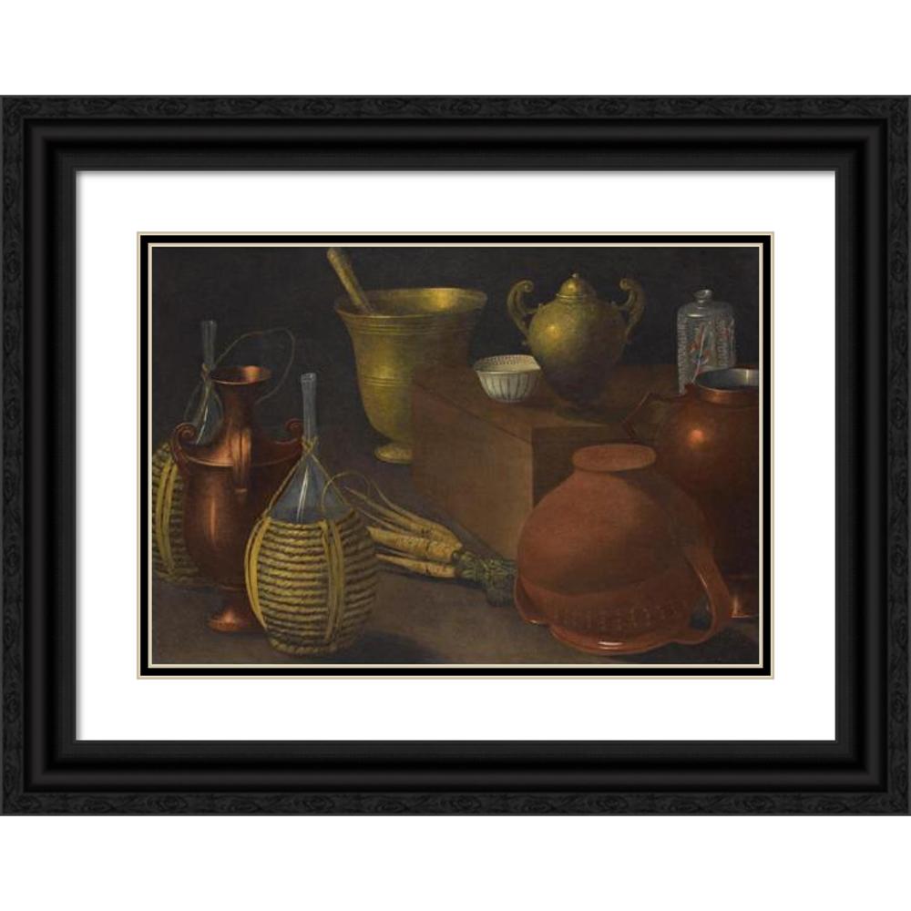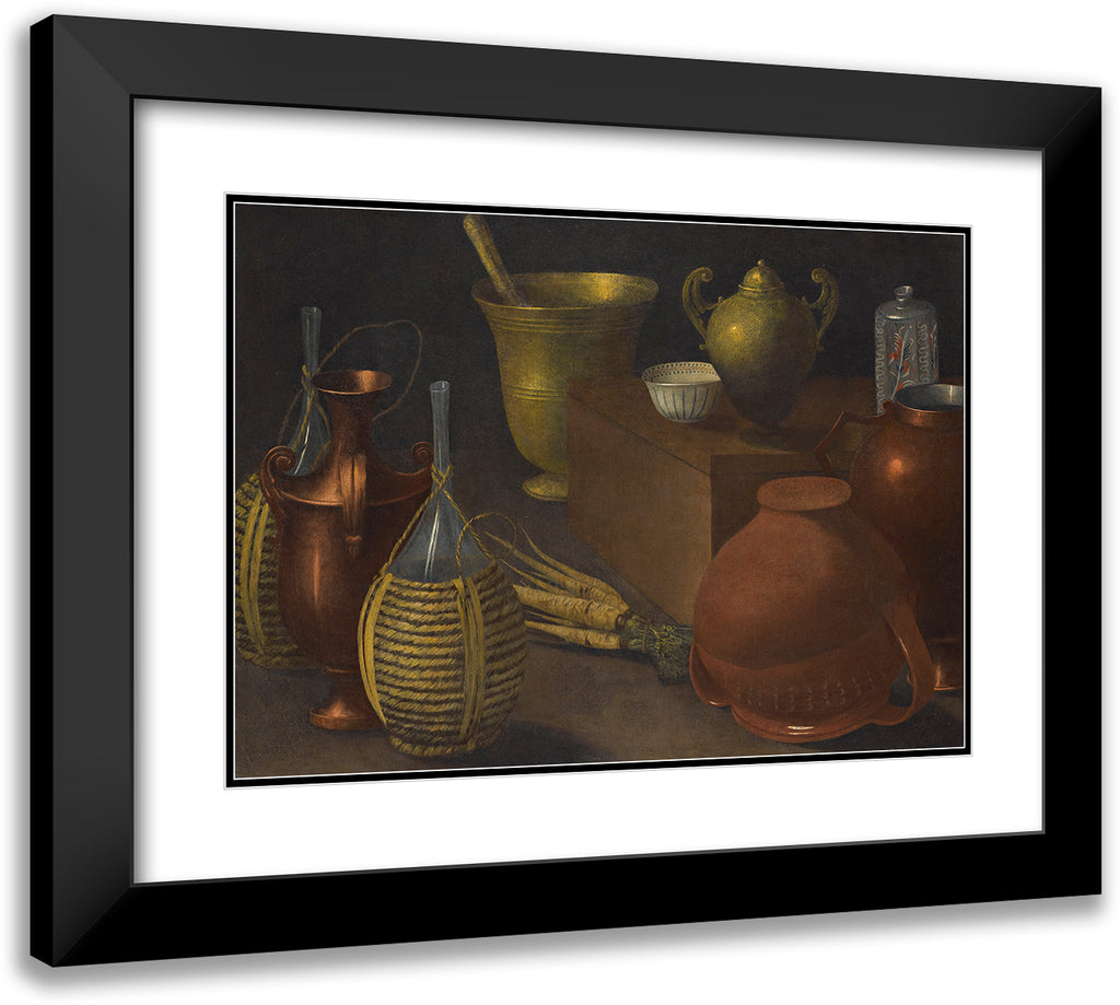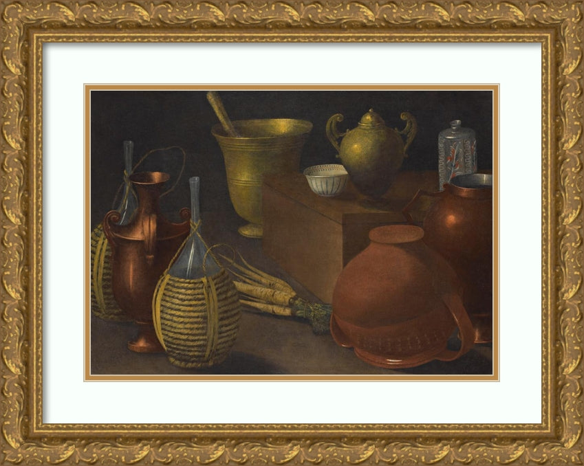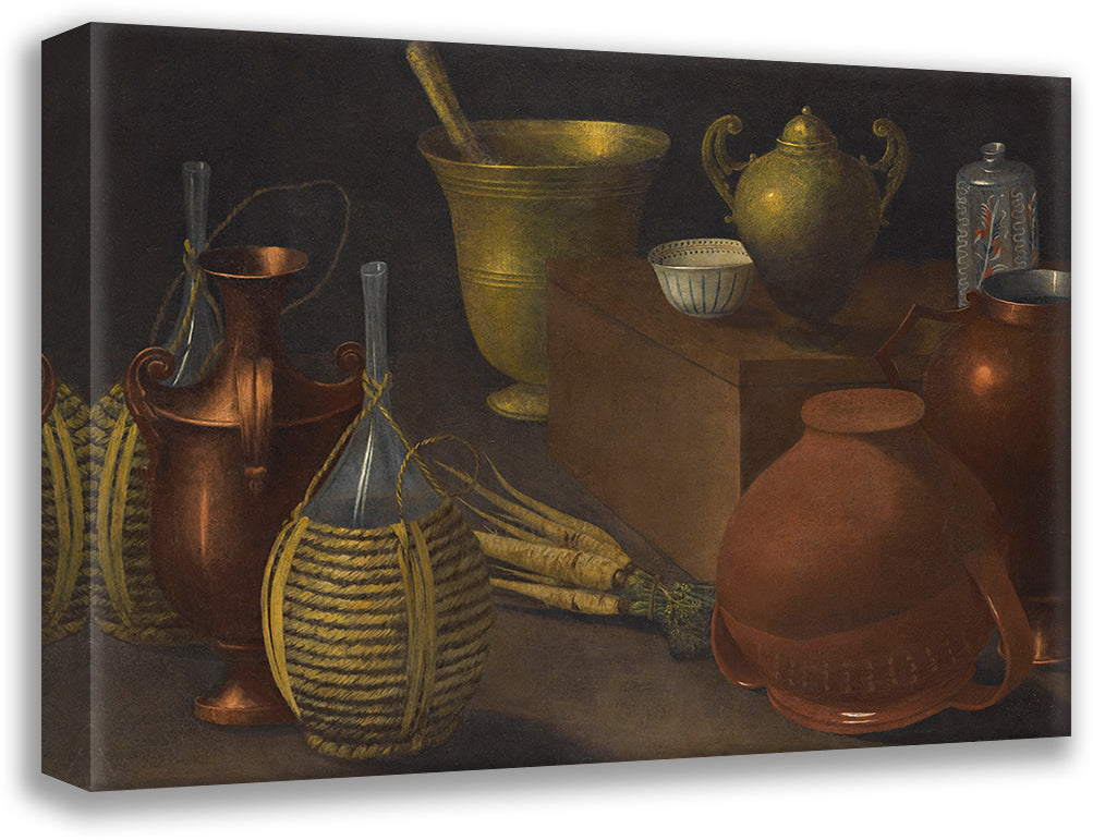 A Still Life with Two Wicker Covered Glass Bottles, an Upturned Terracotta Pot, a Selection of Other Vessels and a Bunch of Carrots.